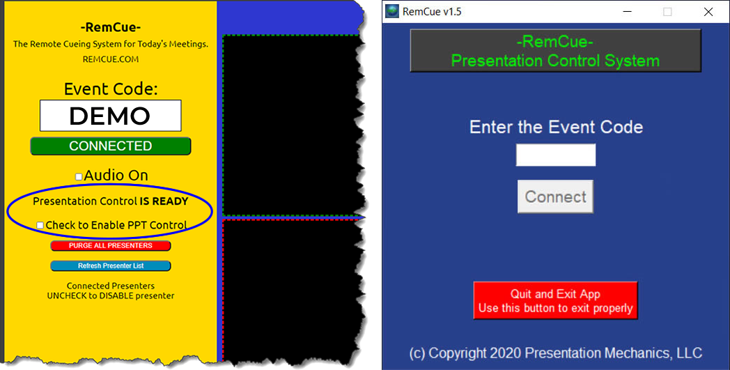 The recommended set up for the show laptop is with an external monitor or graphics switcher, attached to it, otherwise you might experience a small lag in PowerPoint's response to clicks. It's an anomaly with PowerPoint and not RemCue.